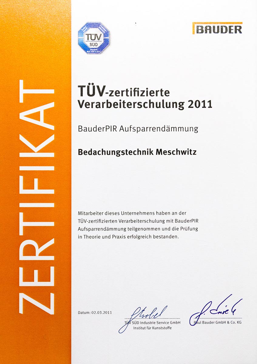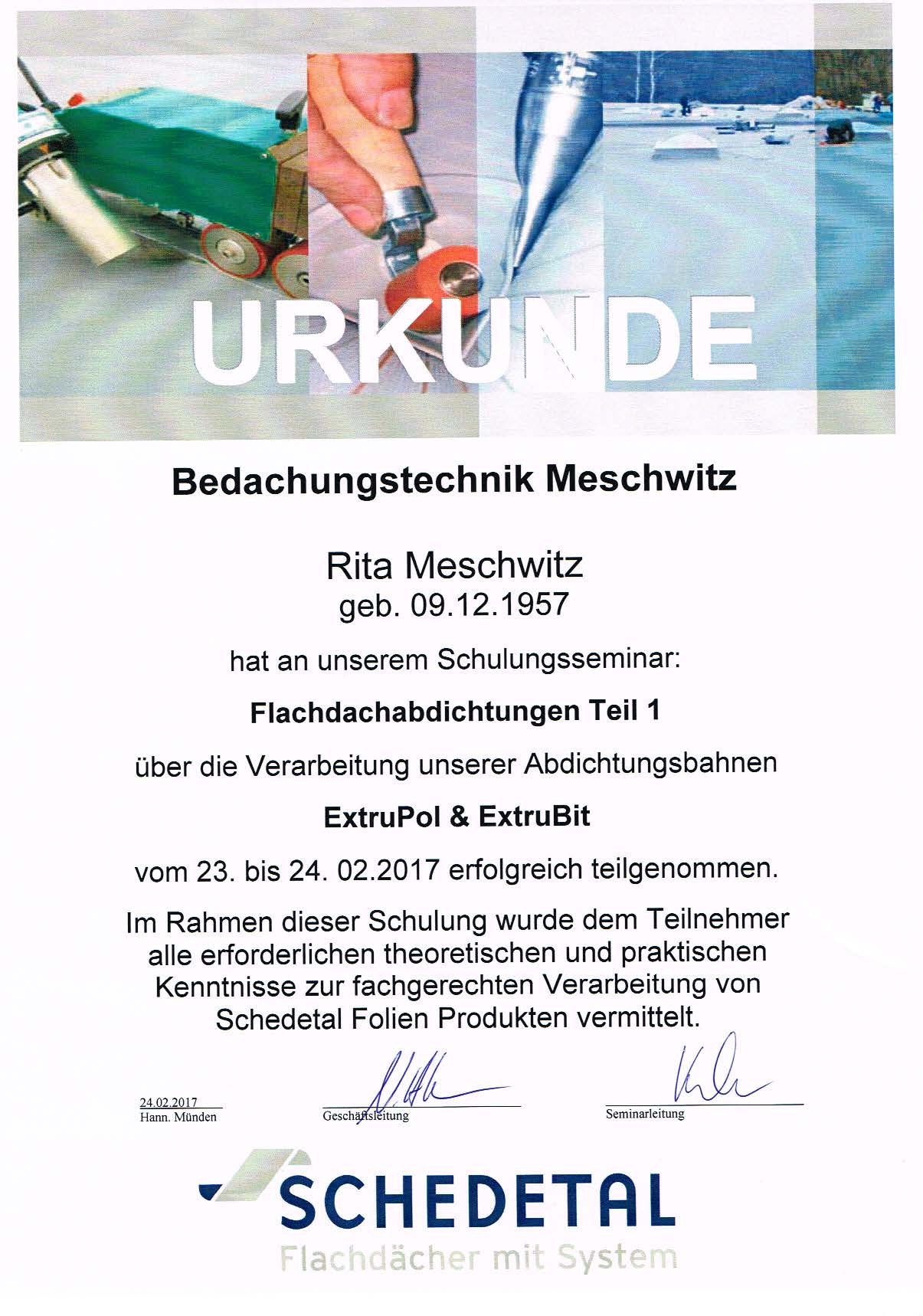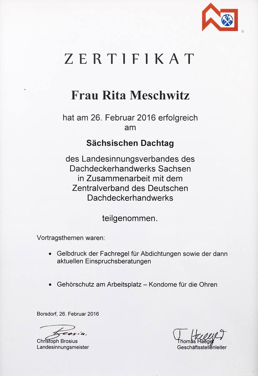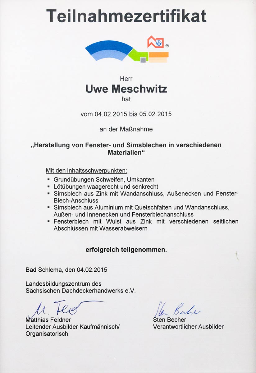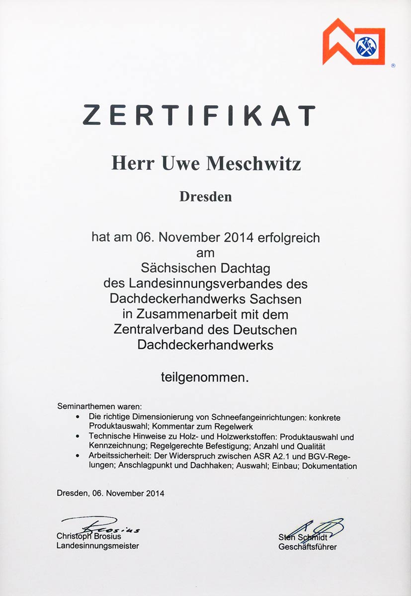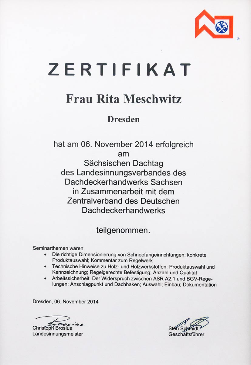 2009 Lehrgang zum Erwerb der Sachkunde für Abbruch Sanierungs und Instandsetzungsarbeiten mit Asbestzementprodukten2011 Bauder THERMOPLAN Kunststoffdachbahnen2011 BauderPIR Aufsparrendaemmung2012 Professionelle Baustellenabwicklung2013 Forum Gebaeudehülle2013 Lehrgang Flachdach Leckortung2013 VELUX Neuheitenschulung2014 Bauder Flachdach Systeme (Bitumen)2014 Bauder THERMOPLAN Kunststoffdachbahnen2014 Schneefangeinrichtungen Technische Hinweise zu Holz und Holzwerkstoffen Arbeitssicherheit Rita Meschwitz2014 Schneefangeinrichtungen Technische Hinweise zu Holz und Holzwerkstoffen Arbeitssicherheit Uwe Meschwitz2015 DANKURKUNDE BiBB2015 DWS Pohl Flachdach Absturzsicherungen2015 Fortbildungslehrgang zur Sachkunde nach TRGS 5192015 Herstellung von Fenster und Simsblechen in verschiedenen Materialien Groer2015 Herstellung von Fenster und Simsblechen in verschiedenen Materialien Meschwitz2015 WIRTSCHAFTLICHKEIT UND BAUPHYSIK BEI DER AUFSPARRENDAeMMUNG2016 FDT Flachdachtechnologie Lorenzo Greborsche2016 FDT Flachdachtechnologie Toni Fleischer2016 Gelbdruck und Gehoerschutz2016 QUALIFIKATIONSNACHWEIS GRUNDLAGEN FALZTECHNIK2016 RHEINZINKer.png2016 VELUX Geschuler Betrieb2017-01 TÜV SÜD-zertifizierte Verarbeiterschulung 2017 BauderPIR Aufsparrendämmung Roto Wohndachfenster2017-01 TÜV SÜD-zertifizierte Verarbeiterschulung 2017 BauderPIR Aufsparrendämmung VELUX Dachfenster2017-01 Zertifikat VELUX Deutschland Produktwissen Basis Rita Meschwitz2017-01 Zertifikat VELUX Deutschland Produktwissen Fortgeschrittene Rita Meschwitz2017-02 URKUNDE Flachdachabdichtungen Teil 1 SCHEDETAL Rita Meschwitz2017-02 URKUNDE Flachdachabdichtungen Teil 1 SCHEDETAL Toni Fleischer2017-03 ZERTIFIKAT Flachdach-Absturzsicherungen DWS Pohl Produktschulung Henrik Köber2017-03 ZERTIFIKAT Flachdach-Absturzsicherungen DWS Pohl Produktschulung Uwe Meschwitz2018-01 ZERTIFIKAT Sächsischer Dachtag Landesinnung Sachsen Rita Meschwitz2018-01 ZERTIFIKAT VELUX Montage-Experte Toni Fleischer2018-02 QUALIFIKATIONSNACHWEIS Gaubenbekleidung RHEINZINK Carsten Groer2018-02 TEILNAHMEZERTIFIKAT Decken von eingebundenen Biberkehlen Dirk Beyer2018-02 TEILNAHMEZERTIFIKAT Schieferkurs - deutsche Deckung Henrik Köber2018-03 ZERTIFIKAT Resitrix Aufbaukurs 2 Carlisle Academy Uwe Meschwitz