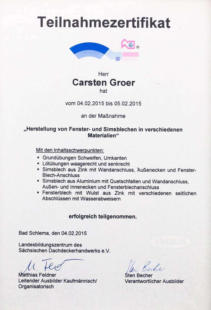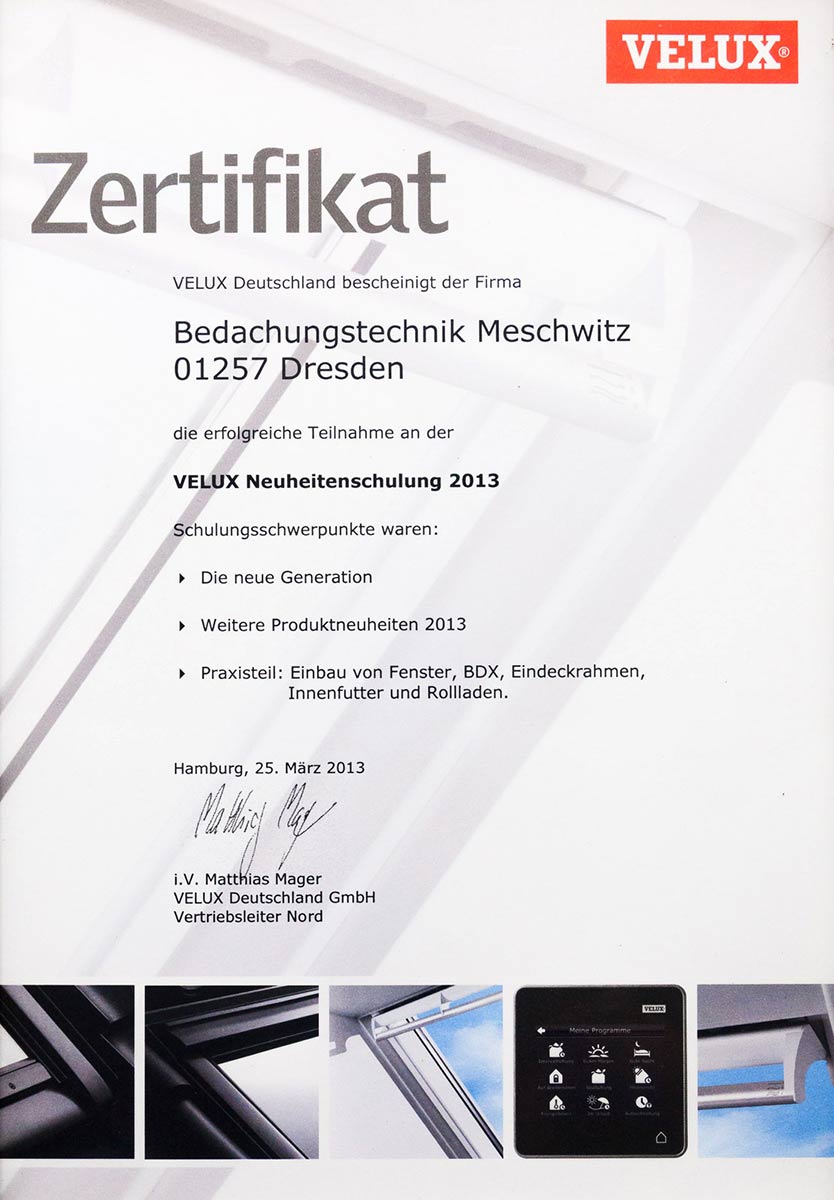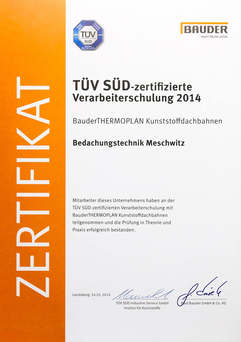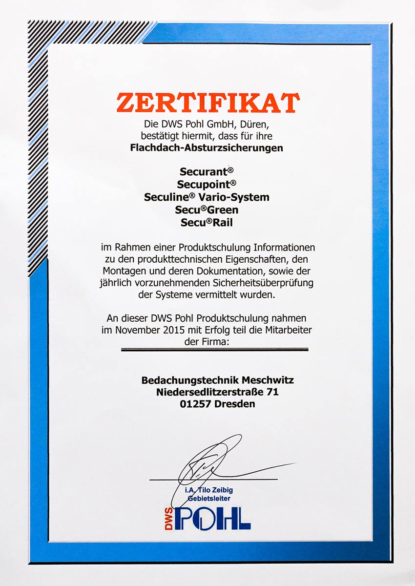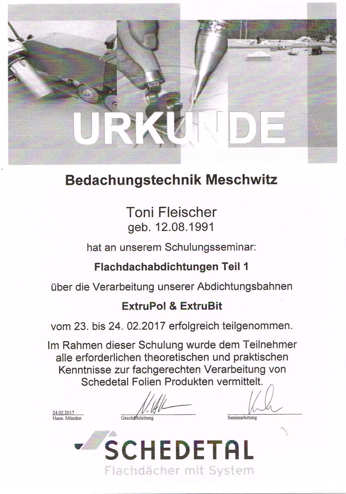 2009 Lehrgang zum Erwerb der Sachkunde für Abbruch Sanierungs und Instandsetzungsarbeiten mit Asbestzementprodukten2011 Bauder THERMOPLAN Kunststoffdachbahnen2011 BauderPIR Aufsparrendaemmung2012 Professionelle Baustellenabwicklung2013 Forum Gebaeudehülle2013 Lehrgang Flachdach Leckortung2013 VELUX Neuheitenschulung2014 Bauder Flachdach Systeme (Bitumen)2014 Bauder THERMOPLAN Kunststoffdachbahnen2014 Schneefangeinrichtungen Technische Hinweise zu Holz und Holzwerkstoffen Arbeitssicherheit Rita Meschwitz2014 Schneefangeinrichtungen Technische Hinweise zu Holz und Holzwerkstoffen Arbeitssicherheit Uwe Meschwitz2015 DANKURKUNDE BiBB2015 DWS Pohl Flachdach Absturzsicherungen2015 Fortbildungslehrgang zur Sachkunde nach TRGS 5192015 Herstellung von Fenster und Simsblechen in verschiedenen Materialien Groer2015 Herstellung von Fenster und Simsblechen in verschiedenen Materialien Meschwitz2015 WIRTSCHAFTLICHKEIT UND BAUPHYSIK BEI DER AUFSPARRENDAeMMUNG2016 FDT Flachdachtechnologie Lorenzo Greborsche2016 FDT Flachdachtechnologie Toni Fleischer2016 Gelbdruck und Gehoerschutz2016 QUALIFIKATIONSNACHWEIS GRUNDLAGEN FALZTECHNIK2016 RHEINZINKer.png2016 VELUX Geschuler Betrieb2017-01 TÜV SÜD-zertifizierte Verarbeiterschulung 2017 BauderPIR Aufsparrendämmung Roto Wohndachfenster2017-01 TÜV SÜD-zertifizierte Verarbeiterschulung 2017 BauderPIR Aufsparrendämmung VELUX Dachfenster2017-01 Zertifikat VELUX Deutschland Produktwissen Basis Rita Meschwitz2017-01 Zertifikat VELUX Deutschland Produktwissen Fortgeschrittene Rita Meschwitz2017-02 URKUNDE Flachdachabdichtungen Teil 1 SCHEDETAL Rita Meschwitz2017-02 URKUNDE Flachdachabdichtungen Teil 1 SCHEDETAL Toni Fleischer2017-03 ZERTIFIKAT Flachdach-Absturzsicherungen DWS Pohl Produktschulung Henrik Köber2017-03 ZERTIFIKAT Flachdach-Absturzsicherungen DWS Pohl Produktschulung Uwe Meschwitz2018-01 ZERTIFIKAT Sächsischer Dachtag Landesinnung Sachsen Rita Meschwitz2018-01 ZERTIFIKAT VELUX Montage-Experte Toni Fleischer2018-02 QUALIFIKATIONSNACHWEIS Gaubenbekleidung RHEINZINK Carsten Groer2018-02 TEILNAHMEZERTIFIKAT Decken von eingebundenen Biberkehlen Dirk Beyer2018-02 TEILNAHMEZERTIFIKAT Schieferkurs - deutsche Deckung Henrik Köber2018-03 ZERTIFIKAT Resitrix Aufbaukurs 2 Carlisle Academy Uwe Meschwitz