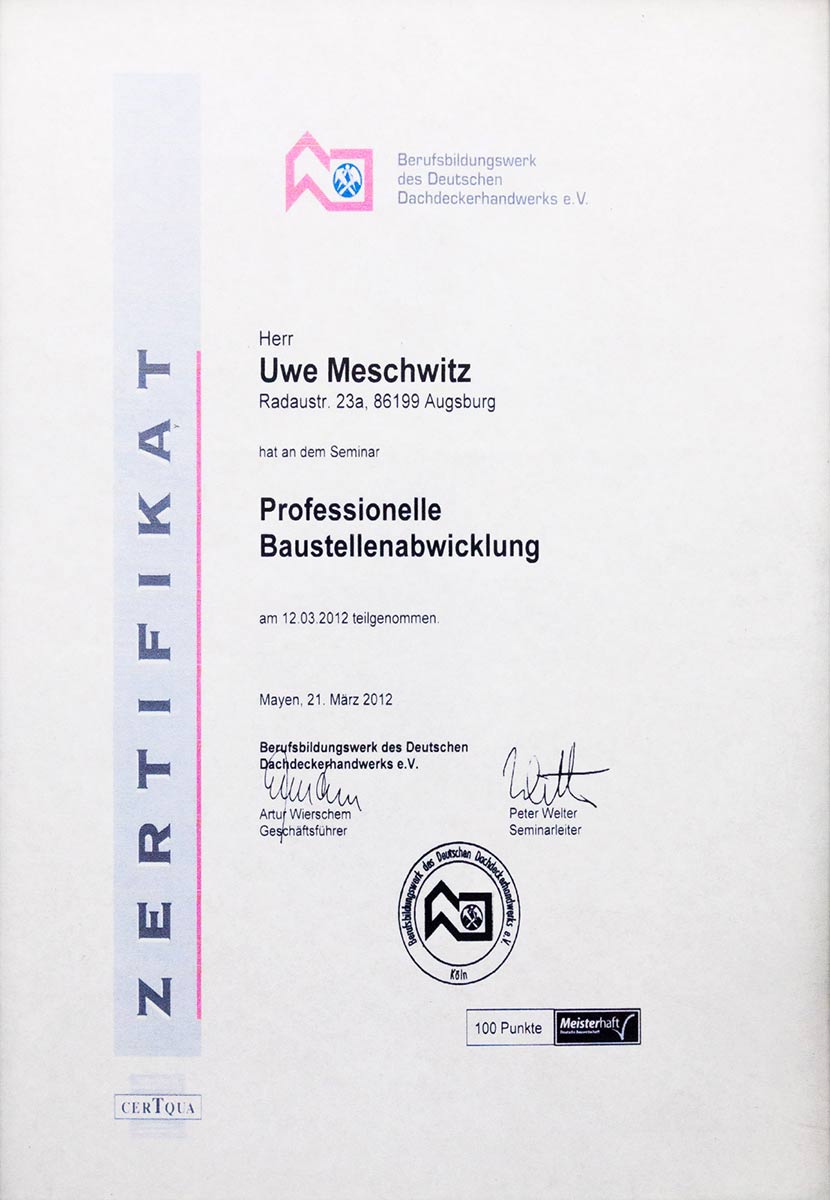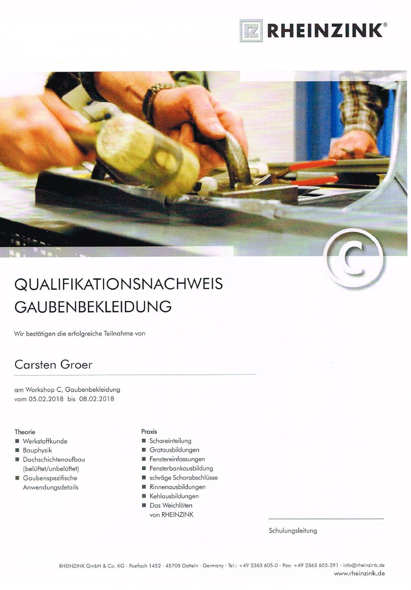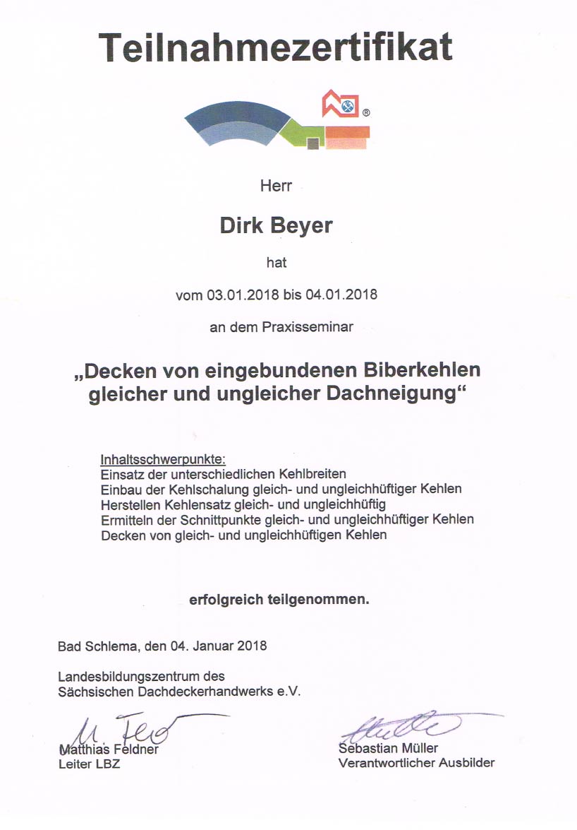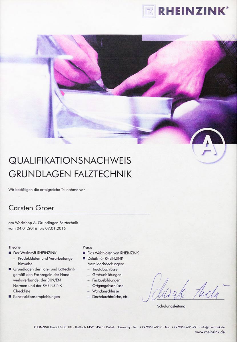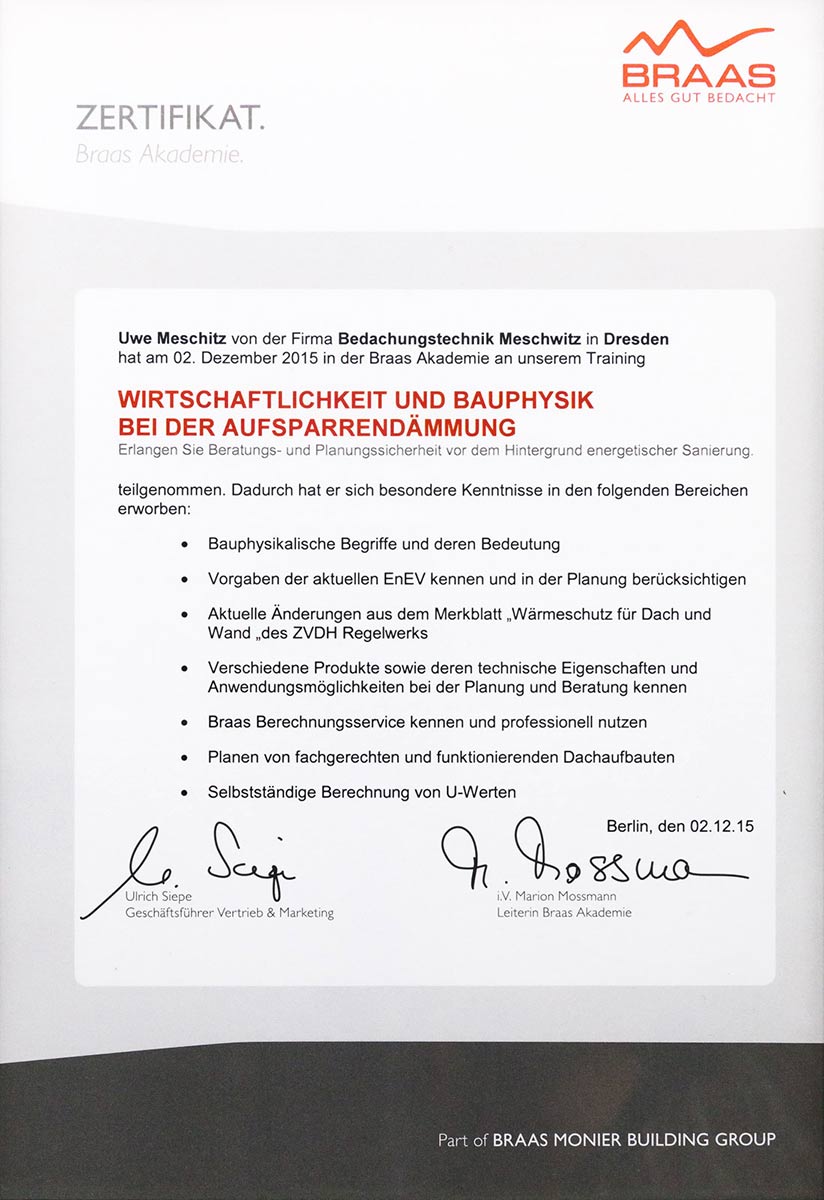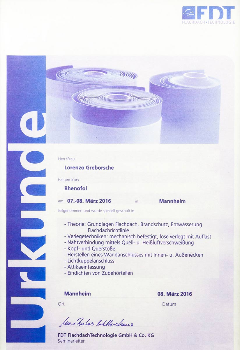 2009 Lehrgang zum Erwerb der Sachkunde für Abbruch Sanierungs und Instandsetzungsarbeiten mit Asbestzementprodukten2011 Bauder THERMOPLAN Kunststoffdachbahnen2011 BauderPIR Aufsparrendaemmung2012 Professionelle Baustellenabwicklung2013 Forum Gebaeudehülle2013 Lehrgang Flachdach Leckortung2013 VELUX Neuheitenschulung2014 Bauder Flachdach Systeme (Bitumen)2014 Bauder THERMOPLAN Kunststoffdachbahnen2014 Schneefangeinrichtungen Technische Hinweise zu Holz und Holzwerkstoffen Arbeitssicherheit Rita Meschwitz2014 Schneefangeinrichtungen Technische Hinweise zu Holz und Holzwerkstoffen Arbeitssicherheit Uwe Meschwitz2015 DANKURKUNDE BiBB2015 DWS Pohl Flachdach Absturzsicherungen2015 Fortbildungslehrgang zur Sachkunde nach TRGS 5192015 Herstellung von Fenster und Simsblechen in verschiedenen Materialien Groer2015 Herstellung von Fenster und Simsblechen in verschiedenen Materialien Meschwitz2015 WIRTSCHAFTLICHKEIT UND BAUPHYSIK BEI DER AUFSPARRENDAeMMUNG2016 FDT Flachdachtechnologie Lorenzo Greborsche2016 FDT Flachdachtechnologie Toni Fleischer2016 Gelbdruck und Gehoerschutz2016 QUALIFIKATIONSNACHWEIS GRUNDLAGEN FALZTECHNIK2016 RHEINZINKer.png2016 VELUX Geschuler Betrieb2017-01 TÜV SÜD-zertifizierte Verarbeiterschulung 2017 BauderPIR Aufsparrendämmung Roto Wohndachfenster2017-01 TÜV SÜD-zertifizierte Verarbeiterschulung 2017 BauderPIR Aufsparrendämmung VELUX Dachfenster2017-01 Zertifikat VELUX Deutschland Produktwissen Basis Rita Meschwitz2017-01 Zertifikat VELUX Deutschland Produktwissen Fortgeschrittene Rita Meschwitz2017-02 URKUNDE Flachdachabdichtungen Teil 1 SCHEDETAL Rita Meschwitz2017-02 URKUNDE Flachdachabdichtungen Teil 1 SCHEDETAL Toni Fleischer2017-03 ZERTIFIKAT Flachdach-Absturzsicherungen DWS Pohl Produktschulung Henrik Köber2017-03 ZERTIFIKAT Flachdach-Absturzsicherungen DWS Pohl Produktschulung Uwe Meschwitz2018-01 ZERTIFIKAT Sächsischer Dachtag Landesinnung Sachsen Rita Meschwitz2018-01 ZERTIFIKAT VELUX Montage-Experte Toni Fleischer2018-02 QUALIFIKATIONSNACHWEIS Gaubenbekleidung RHEINZINK Carsten Groer2018-02 TEILNAHMEZERTIFIKAT Decken von eingebundenen Biberkehlen Dirk Beyer2018-02 TEILNAHMEZERTIFIKAT Schieferkurs - deutsche Deckung Henrik Köber2018-03 ZERTIFIKAT Resitrix Aufbaukurs 2 Carlisle Academy Uwe Meschwitz